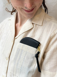 A small leather pouch with a zip. This perfect little leather wallet has one main compartment and one card slot which can hold several cards. Fits perfectly in a back pocket. Made from buttery, black, organically tanned leather that will darken and get better with age. This leather has been produced using organic materials as opposed to environmentally harmful chemicals. It has a nostalgic, earthy smell, and a tough durable feel. It will develop a patina over time, like beautifully worn in saddle.